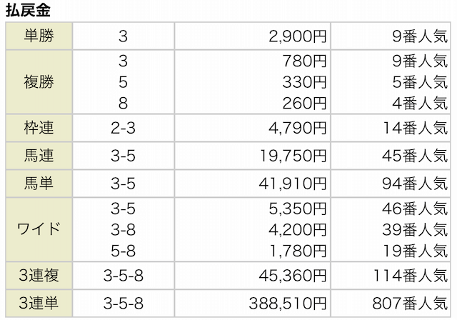 3連単は3885.1倍の配当がつきました!